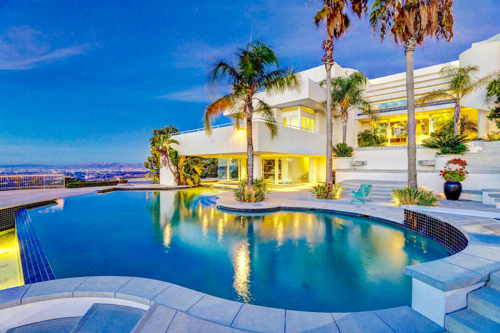 The gated estate offers privacy, steel frame construction, wine cellar, billiards room with wet bar, two custom offices, and state-of-the-art technology. The estate’s resort-like grounds are as impressive as the residences. Aztec Estate offers the versatility to retreat in serenity or entertain elaborate and lavish events on the estate grounds which feature an infinity-edged pool, steam room and spa, tennis and basketball courts, outdoor kitchen and bar, and fire pit. Lush gardens include approximately 1,000 palm trees, various terraces and seating areas, fountains, waterfall, and wraparound decks with endless views.