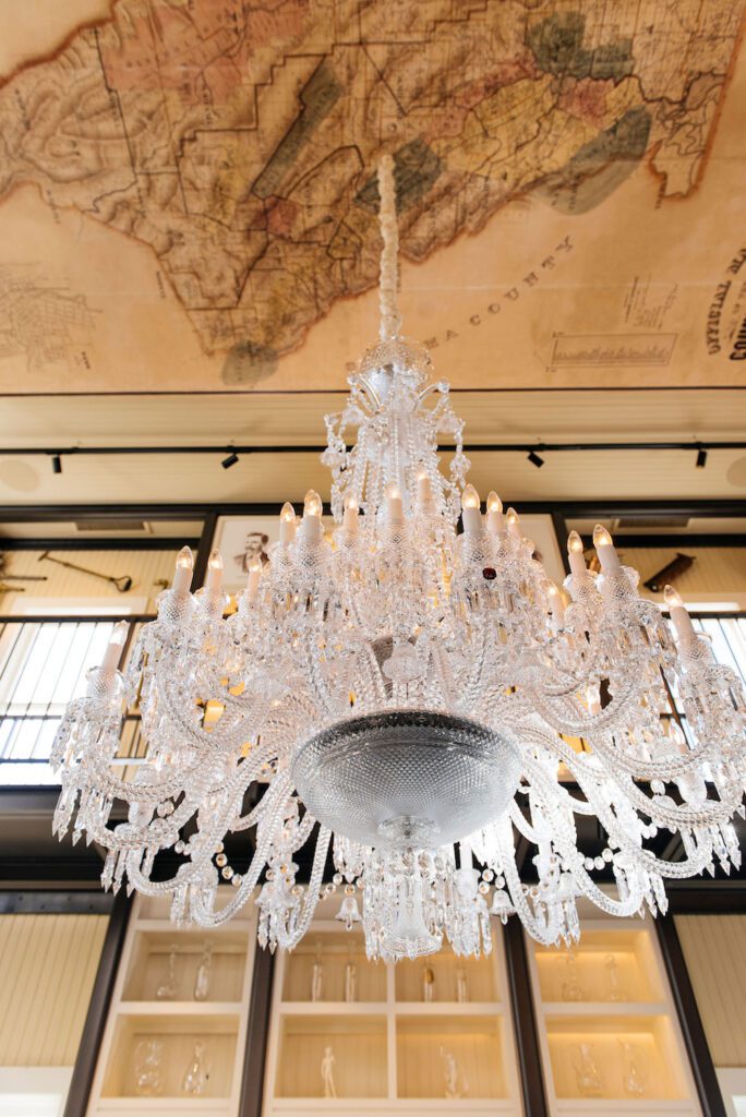 The unique horizontal tasting experience is focused on terroir, inviting guests to sample same-vintage varietals from different American Viticultural Areas (AVAs). Boisset’s goal? To educate, in an approachable way, wine aficionados on the importance of the soil and how it changes the taste, body, and texture of the same wine. Maps and detailed information on each of Napa Valley’s 16 AVAs line the walls and ceiling of the beautifully restored 2-story building from which a gargantuan, glittering chandelier hangs 30 feet above. The 48-light Baccarat crystal Zenith chandelier complements the one-of-a-kind decanters from Boisset’s personal collection lining the walls. In partnership with Baccarat, he also designed a collection of exclusive glassware guests can sip from when visiting the tasting room.