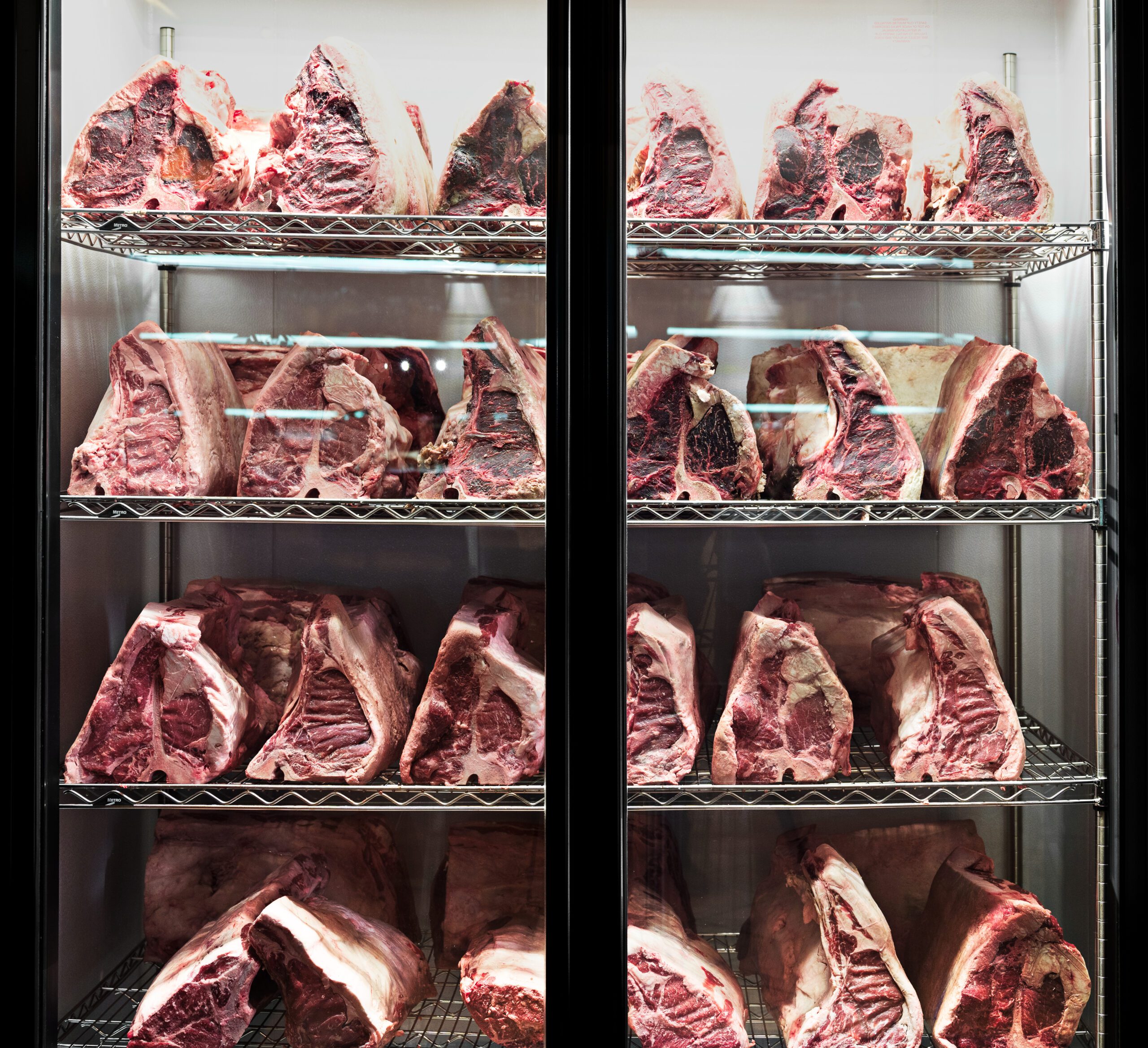 Porterhouse sources its beef from stockyards in Omaha, NE; dry aged, grass-fed cuts are sourced from local California ranches. Ugur’s son Steve serves as director of butchering; he was introduced to the art of in-house, dry-aging in 2013 and is constantly bringing new innovations to the program. Steaks (Porterhouse, Kanas City Strip, Cowboy Ribeye, and Filet Mignon) are dried from 21 to 120 days in a temperature and humidity-controlled room. A 28 day hangtime builds flavor and influences tenderization.