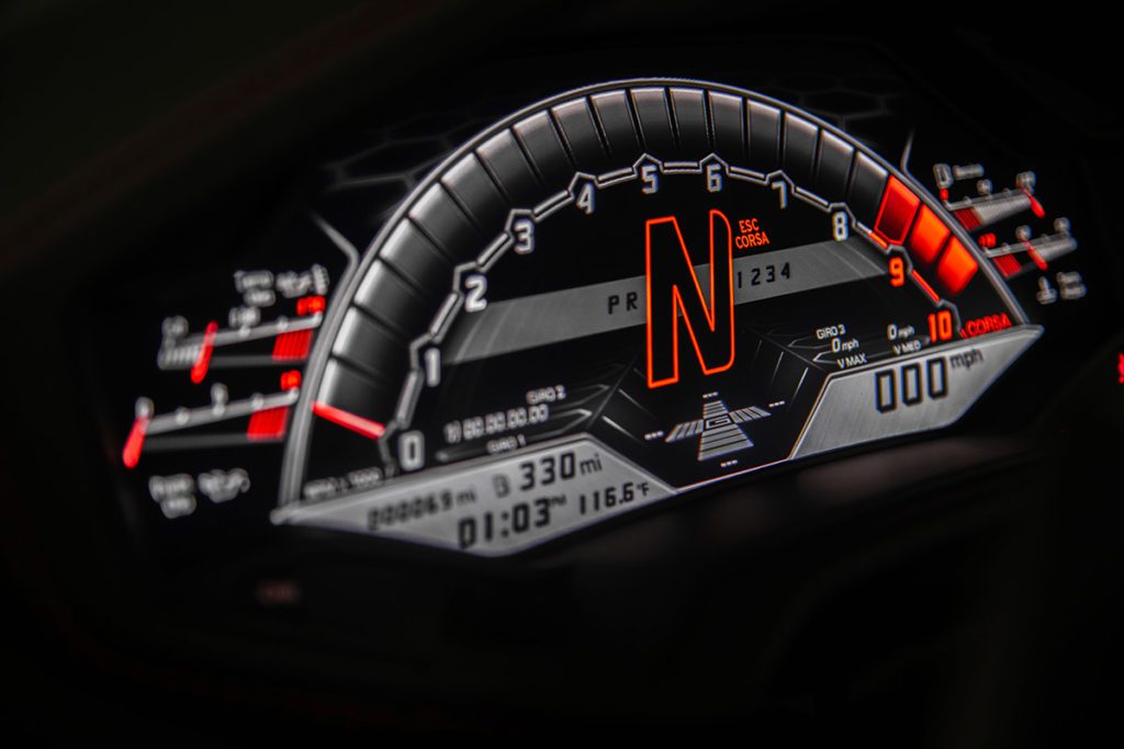 The Huracán model of Lamborghinis arrived in 2014 as a replacement for the “entry level” Lamborghini, the Gallardo. (Huracán and Gallardo, like virtually all Lamborghinis, are names of fighting bulls, though “Huracán” also is a Spanish word for “hurricane”.) Since its arrival, the Huracán has been refined and adjusted and the Evo is the natural evolution of the line (thus providing a major hint at the origin of the model’s name). The Evo clearly looks like the other Huracáns though refinements and other changes are quite apparent. For example, the front bumper is redesigned to work well with the new front splitter and its integrated wing, the sides show changes in the look of the windows and air intakes while the rear sports elevated exhaust pipes (pay attention, motorcyclists!) and a redesigned slotted spoiler. The wheel design also is new on this model.